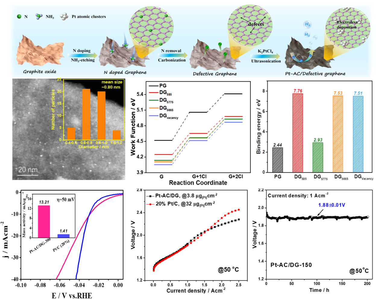 该工作中研究人员利用新颖的、碳缺陷驱动自发沉积新方法,构筑由缺陷石墨烯负载高分散、超小(< 1nm)且稳定的Pt原子级团簇(Pt-AC)水电解析氢(HER)电催化剂(图1)。理论研究表明:与完美六元环碳位点相比,缺陷碳位点具有更低的表面功函数、更高的还原能力,从而在缺陷位点处优先触发Pt离子自发沉积。碳缺陷与Pt之间更强的结合能力有效限制了自发还原Pt原子的迁移,确保超小Pt-AC的形成和稳定。上海光源同步辐射进一步验证了Pt-AC与碳缺陷之间较强的电子作用,赋予其有别于传统Pt纳米颗粒独特的电子结构。Pt-AC呈现了优异的HER电催化性能,与传统Pt/C催化剂相比,其质量比活性、Pt原子利用效率和稳定性均得到大幅提升。组装的质子交换膜水电解器件在实现安培级产氢电流的同时,阴极Pt用量降低到约1/10,且展现出优异的稳定性。本项目的进展将对氢能领域的开展和实现氢能经济具有重要的科学和实践意义。