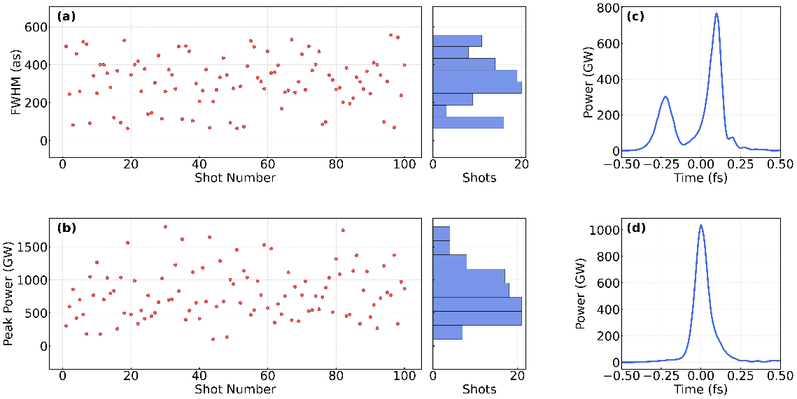 在考虑超导模组射频相位抖动等实际运行条件的情况下,数值模拟结果表明,SHINE在硬X射线波段(6 keV)可产生平均脉宽约300阿秒、峰值功率约0.8 太瓦的X射线脉冲(图2)。在1 keV软X射线波段,可实现平均脉宽约470阿秒、峰值功率同样达到太瓦量级的输出(图3)。
